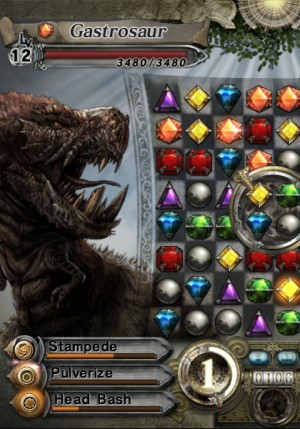 Oddly, this actually makes the game feel less frustrating than Puzzle Quest by several orders of magnitude. Instead of waiting while the computer makes a move, the responsibility for every success and failure is squarely on your shoulders. Getting lucky cascades certainly helps, but usually clearing the board is a matter of knowing what you’re doing and paying attention as things drop. The only part that’s really frustrating is the fact that the combo meter resets every time you make a turn that doesn’t result in a destruction, which means that once gems start showing up that you need to target right away, you’re essentially forced into dropping whatever combo you had up to that point. It’s not game-breaking, but it is annoying.