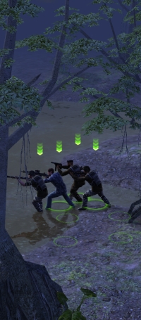 Unfortunately, the developers forget to inform you how to do any of this. Which is why I take the tutorial so hard to task for all of this. Rather than the demo mission showing off all of the neat things that you can do, it becomes an exercise in frustration as you try to figure out what the developers meant for you to do. Send this one up to the north and – no, spotted, now he’s dead. Maybe I can send the group south and – no, dead again. All right, slowly creep around to the south, carefully set up fields of fire, and… well, that went better, but we’re all still dead. Perhaps if I go a bit more to the west…